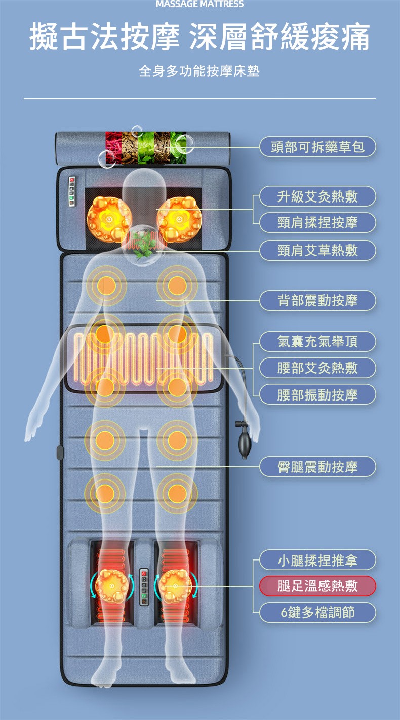 7分鐘前多功能全身按摩床墊 | 電動加熱頸椎、腰部、背部、腿部全方位按摩器,舒緩身心疲勞 - 6鍵旗艦款(6鍵揉捏+震動+氣囊+10電機+腰部熱敷)